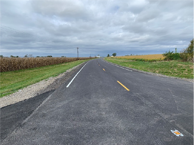 This project improved 3.2 miles of County Highway 10, from IL Route 153 to near Elkton. The existing roadway, with narrow 11-foot lanes and minimal shoulders, was insufficient for heavy agricultural traffic. Improvements included widening by 2 feet on each side, adding 10-inch HMA shoulders and 2-foot aggregate wedge shoulders, milling and overlaying the pavement, and installing new pavement markings and raised reflective markers.