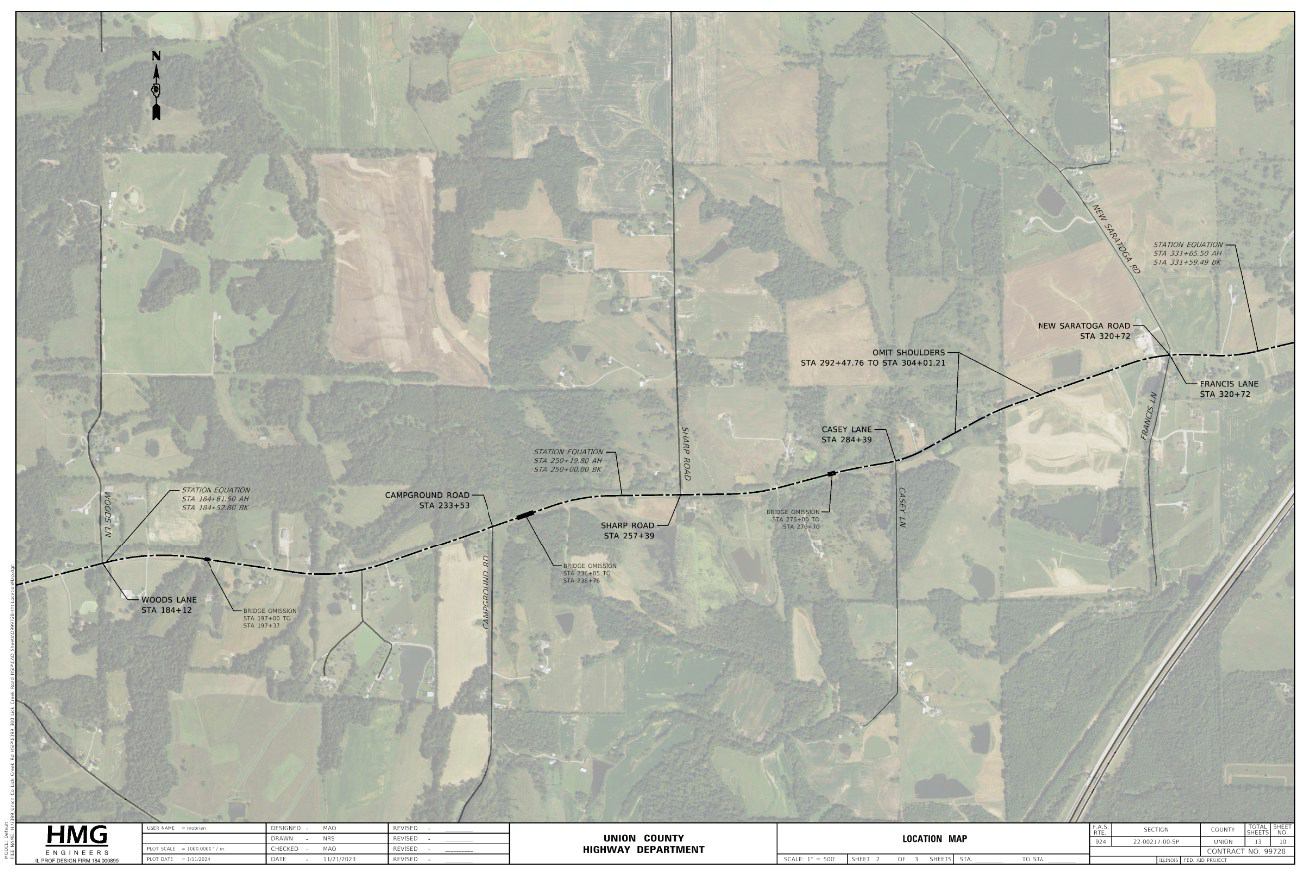 HMG designed safety improvements for 9.4 miles of Lick Creek Road in Union County, including new shoulders with rumble strips, reflective markers, and curve warning signs, with construction set for 2024.