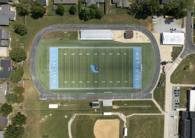 Another key challenge was drainage. The athletic field sits at the upper limits of the city’s already overloaded drainage system. To address this, the new turf field was designed with an underground aggregate stormwater basin and a small detention basin, maximizing the limited space available within the congested campus.